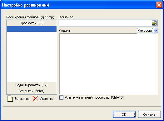 Этот диалог (он вызывается в пункте менюи Настройки\Настройка расширений), позволяет Вам добавлять, удалять и редактировать расширения и прикладные программы, которые будут вызываться, когда Вы нажимаете соответствующую клавишу.Вы можете устанавливать несколько расширений, отделять их ";" и ассоциировать с ними некоторый файл командного файла, что редактируется в правой стороне окна. Вы можете использовать затем макросы:
